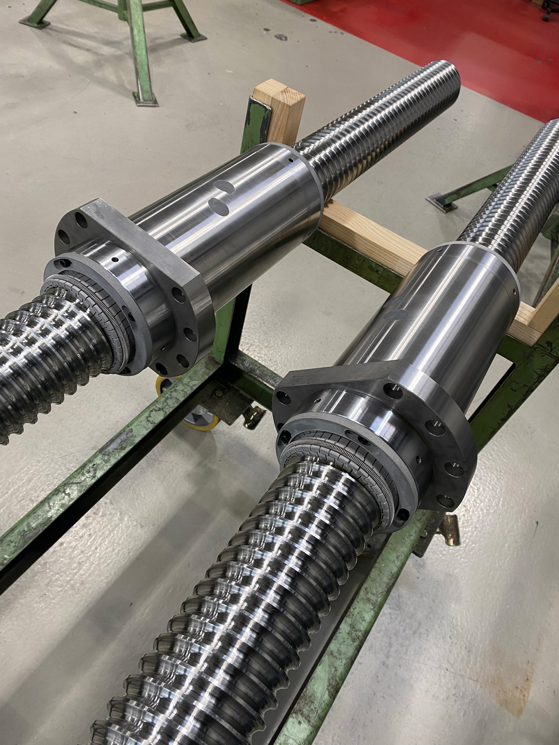 Um diese – auf den ersten Blick gegensätzlichen – Anforderungen zu erfüllen, half Kammerers langjährige Erfahrung bei der Konstruktion von Kugelgewindetrieben für Werkzeugmaschinen. „Für die neue Anwendung musste das bestehende Maschinenkonzept als Grundlage der Neukonstruktion des Kugelgewindetriebs dienen“, erklärt Marcel Wolber, Techniker im Technischen Vertrieb bei Kammerer, der das Nachrüstungsprojekt betreut. „Dies bedeutete, dass der Bauraum begrenzt war. Da deshalb kein größerer Kugelgewindetrieb eingesetzt werden konnte, vergrößerten wir die Steigung des Kugelgewindetriebs um 2 mm auf 100 x 32, was ein zweigängiges Gewinde ermöglichte. Durch eigens gefräste Umlenkstücke konnte bei nahezu gleichbleibender Mutterlänge die Anzahl der Kugeln deutlich erhöht werden. Durch den zweiten Gang und somit deutlich mehr tragende Kugeln konnte die dynamische Tragzahl von 465 kN auf 679 kN um fast 50 Prozent erhöht werden, was die Lebensdauer des Kugelgewindetriebs um das 2,6-fache auf über 22.000 Arbeitsstunden verlängert.“