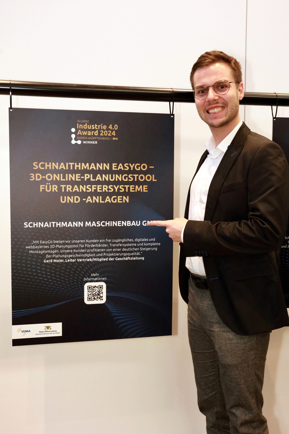 Remshalden, 24. Oktober 2024. Das digitale Planungstool EasyGo des Remshaldener Automatisierungsspezialisten Schnaithmann Maschinenbau GmbH ist mit dem „Allianz Industrie 4.0 Award Baden-Württemberg“ ausgezeichnet worden. Die Preisverleihung fand am 23. Oktober 2024 im Rahmen des Digitalisierungsevents „Startup the Future“ in Stuttgart statt.