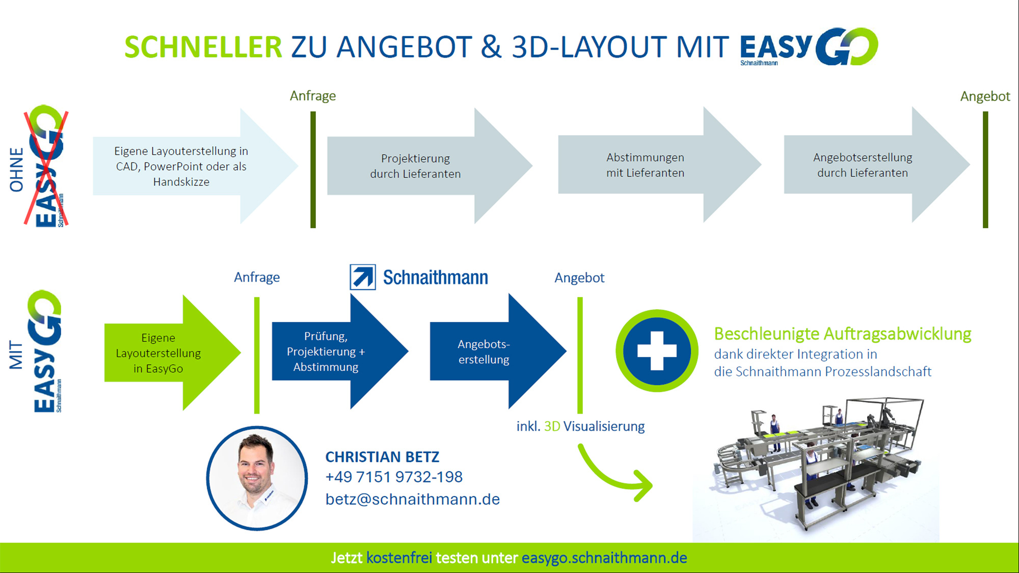 Die von Schnaithmann entwickelte Web-Applikation EasyGo ist ein interdisziplinäres 3D-Online-Planungstool. Es vereinfacht und beschleunigt die Planung von Transferanlagen und -systemen, Montageanlagen und Automatisierungslinien. „Mit EasyGo bieten wir unseren Kunden ein frei zugängliches, digitales und webbasiertes 3D-Planungstool für Förderbänder, Transfersysteme und komplette Montageanlagen“, sagt Gerd Maier, Leiter Vertrieb und Mitglied der Geschäftsleitung bei Schnaithmann. „Seit der Markteinführung 2021 haben wir EasyGo kontinuierlich verbessert und neue Funktionen implementiert. Konstrukteure, Produktionsplaner und Projektingenieure profitieren bei ihren Materialflussprojekten von einer deutlichen Steigerung der Planungsgeschwindigkeit und Projektierungsqualität.“